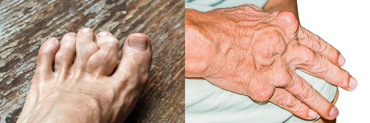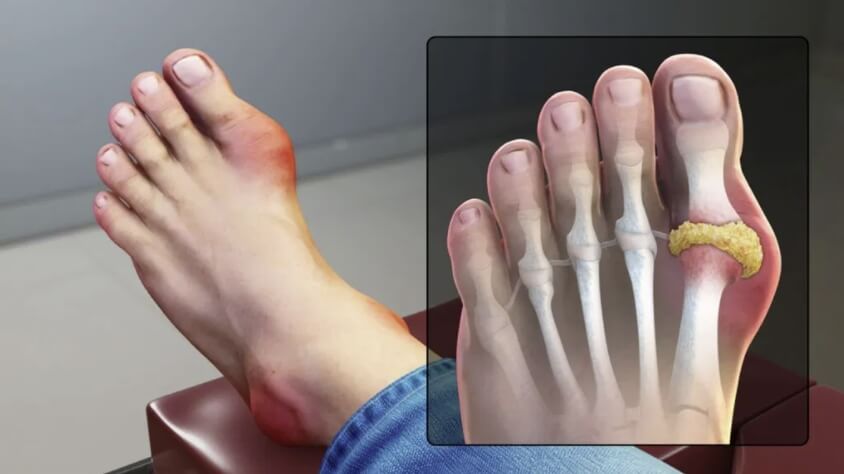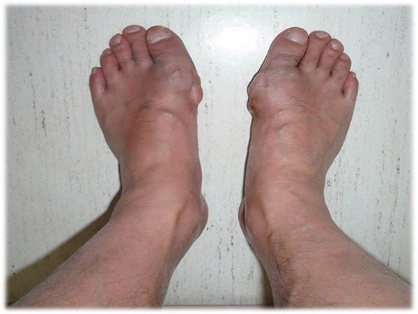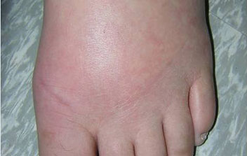 통풍 환자의 몸에는 많은 양의 요산이 축적되는데, 관절 주변에 요산이 쌓이면 관절에 염증반응을 일으켜 관절이 붓게 돼요. 병의 경과가 길어지면 부종은 점점 더 심해져서 점차적으로 발에서 다리까지 이르게 되며, 가장 심한다면 각가지 관절이 붉어지고 부어오르며 염증을 유발하게 돼요.
